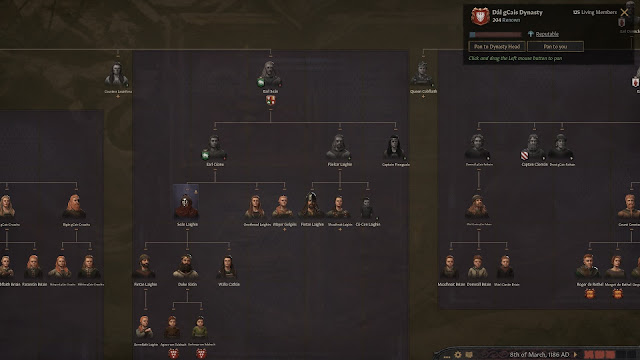 By the year 1186 the borders of Ireland had not changed, as Caindelban was still licking his wounds after the shock of the defeat against the crusaders. He had turned out to be a good steward and developed the traits Architect and Avaricious, along with Thrifty Clerk, which gave him a total stewardship of 18 and some building bonuses. Rather than start other wars, he concentrated on reorganizing his realm and make it more economically viable. He was in fact making 37.1 gold a month, so that he could finance a fairly big army easily.